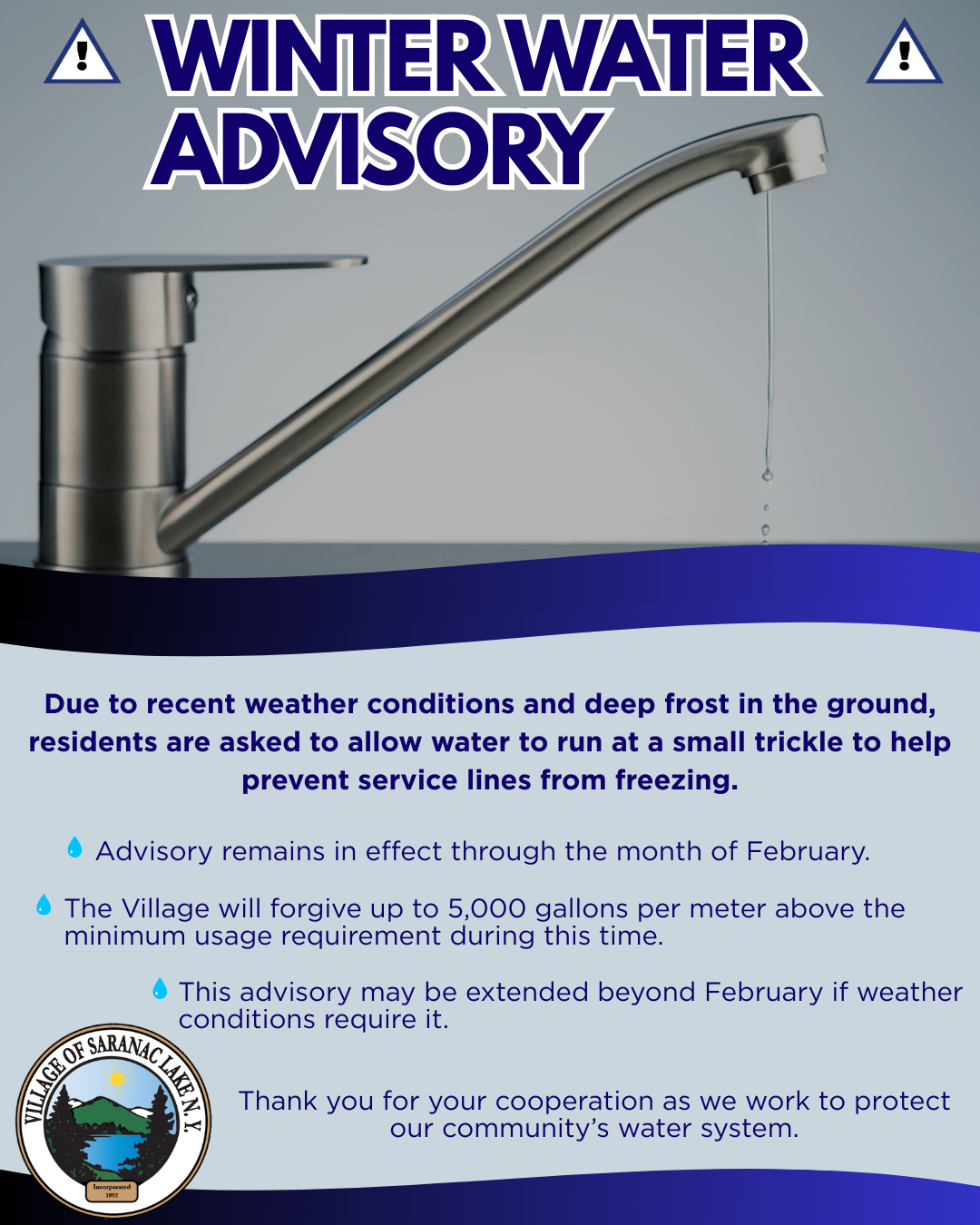 Due to recent weather conditions and deep frost in the ground, residents are asked to allow a small trickle of water to run to help prevent service lines from freezing.
